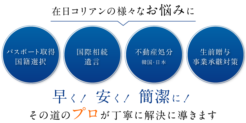 国籍、相続・遺言、韓国不動産処分、登記、領事館での書類取得、翻訳と多岐にわたる業務を国境をまたいでサポートいたします。